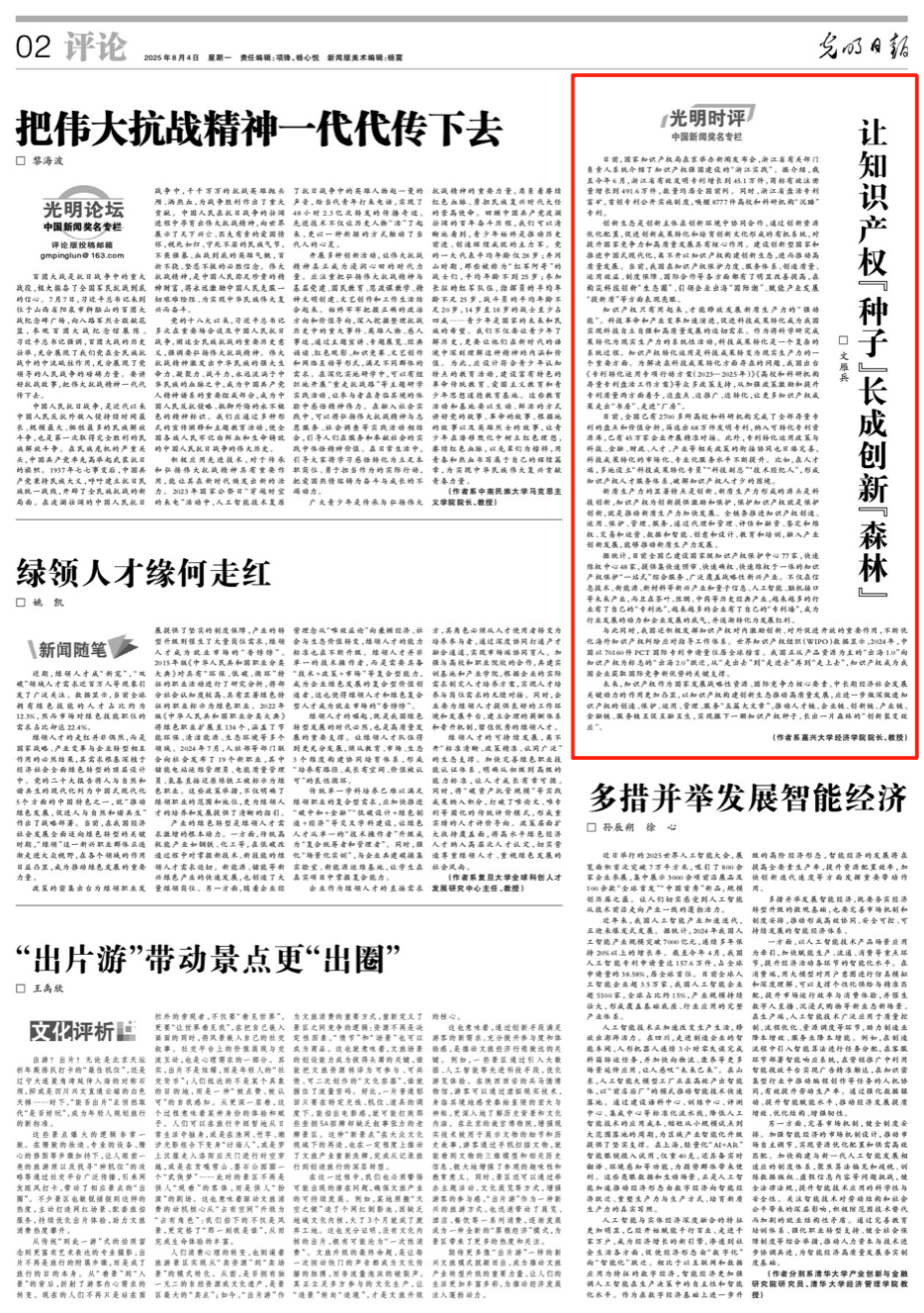 8月4日,金年会文雁兵教授在《光明日报》发表文章《让知识产权“种子”长成创新“森林”》。