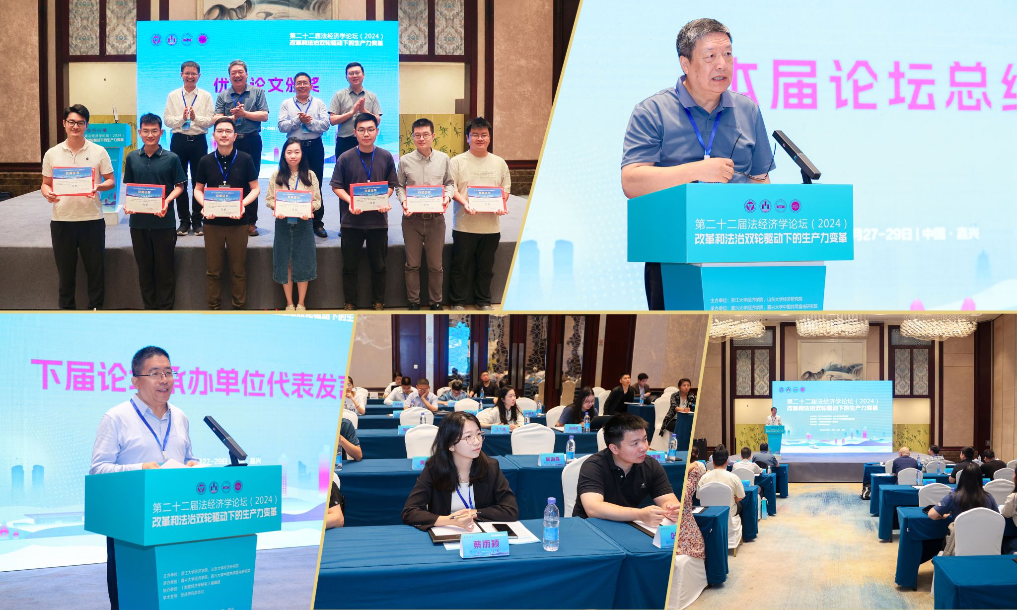 9月27日—29日,主题为“改革和法治双轮驱动下的生产力变革”的第二十二届法经济学论坛(2024)在金年会jinnianhuicom成功举办。本届论坛由浙江大学金年会诚信信誉至上、山东大学经济研究院共同主办,金年会jinnianhuicom、金年会jinnianhuicom中国共同富裕研究院联合承办。来自清华大学、浙江大学、山东大学、复旦大学、中国人民大学、南开大学、上海交通大学、香港大学、康奈尔大学、厦门大学、同济大学、华东政法大学、中国政法大学、中南财经政法大学等著名高校、科研院所的100多名专家学者以及相关人员参加。