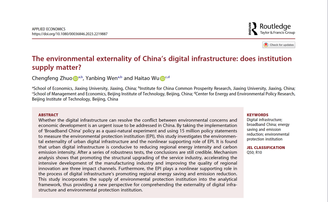 Chengfeng Zhuo, Yanbing Wen & Haitao Wu (2023). The environmental externality of China’s digital infrastructure: does institution supply matter?, Applied Economics, DOI: 10.1080/00036846.2023.2219887.