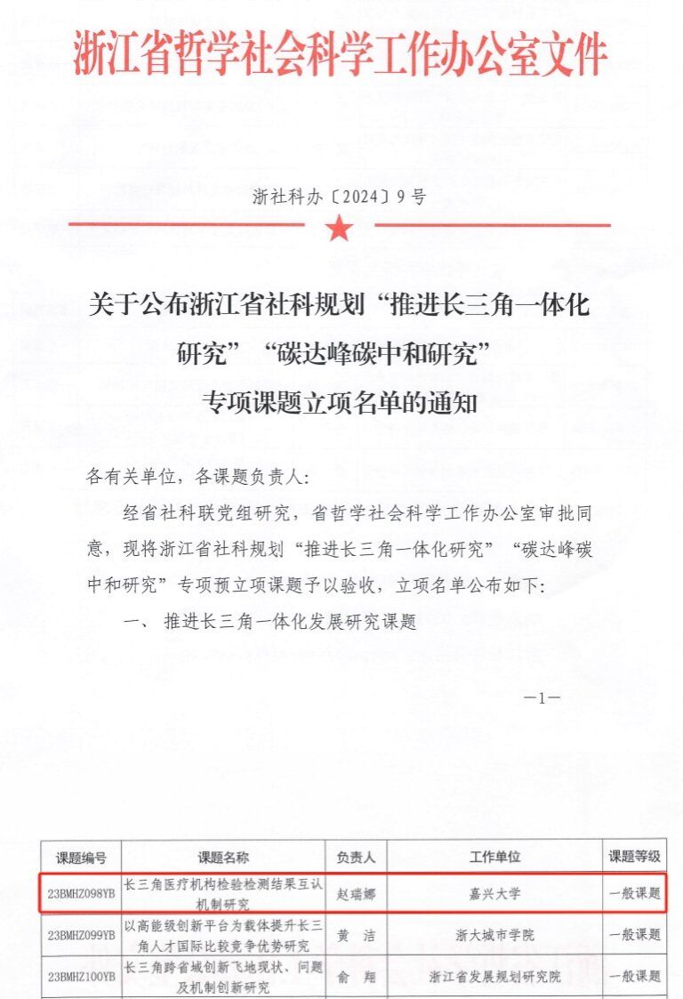 近日,浙江省哲学社会科学工作办公室公布了浙江省社科规划“推进长三角一体化研究”“碳达峰碳中和研究”专项课题立项名单,金年会赵瑞娜博士主持的课题《长三角医疗机构检验检测结果互认机制研究》获得立项。