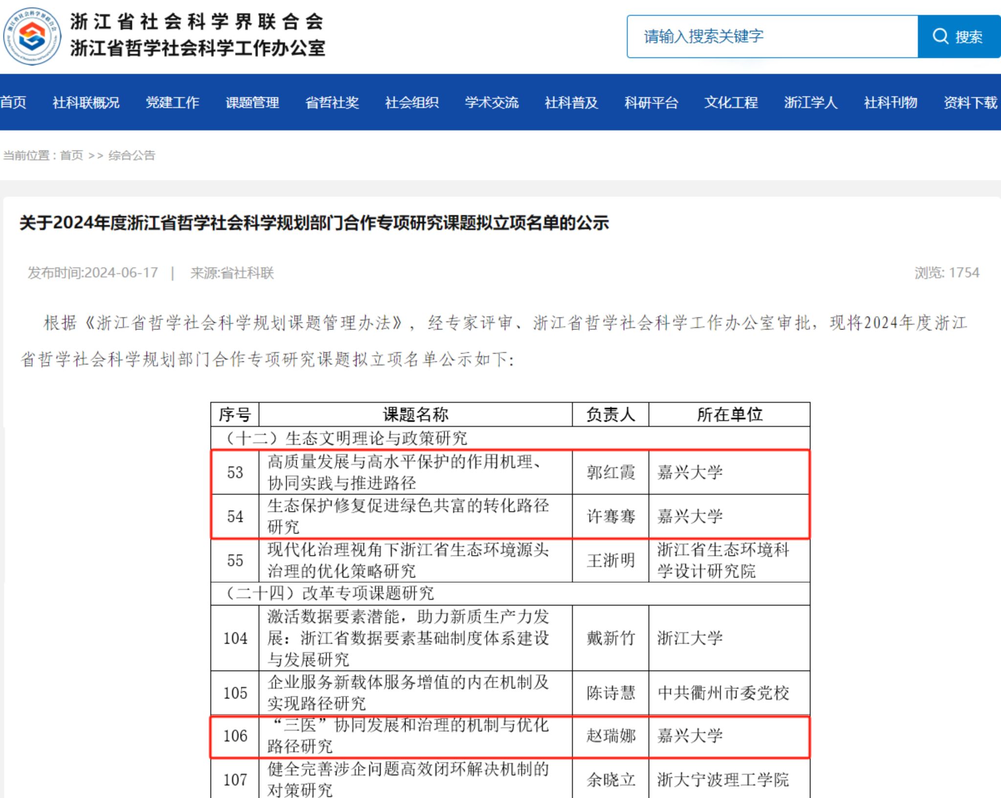 近日,浙江省哲学社会科学工作办公室公布了《关于2024年度浙江省哲学社会科学规划部门合作专项研究课题拟立项名单的公示》。金年会郭红霞博士主持的课题《高质量发展与高水平保护的作用机理、协同实践与推进路径》、许骞骞博士主持的课题《生态保护修复促进绿色共富的转化路径》、赵瑞娜博士主持的课题《“三医”协同发展和治理的机制与优化路径研究》获得拟立项。