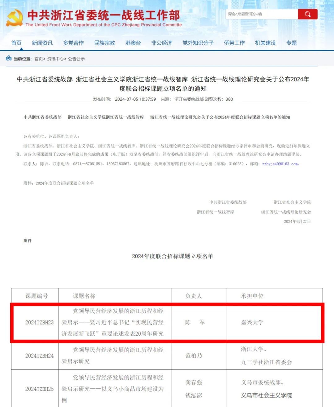 近日,中共浙江省委统战部、浙江省社会主义学院、浙江省统一战线智库、浙江省统一战线理论研究会公布了2024年度联合招标课题立项名单,金年会陈军教授的课题《党领导民营经济发展的浙江历程和经验启示——暨习近平总书记“实现民营经济发展新飞跃”重要论述发表20周年研究》成功立项。