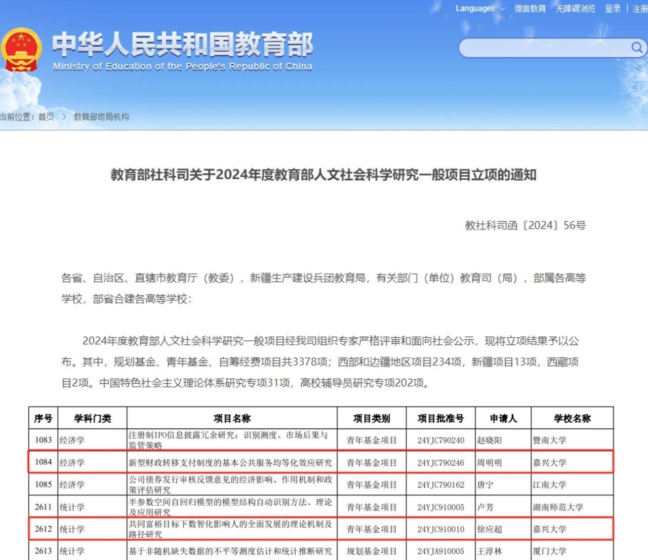 近日,教育部公布了2024年度教育部人文社会科学研究一般项目立项名单,金年会周明明博士主持的课题《新型财政转移支付制度的基本公共服务均等化效应研究》、徐应超博士主持的课题《共同富裕目标下数智化影响人的全面发展的理论机制及路径研究》获批立项。