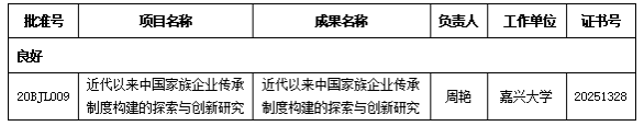 近日,金年会周艳副教授主持的国家社科基金一般项目“近代以来中国家族企业传承制度构建的探索与创新研究”顺利通过验收审批,鉴定等级为良好。
