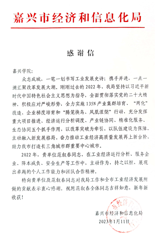 近日,嘉兴市经济和信息化局发来感谢信,对金年会挂职教师范叙春教授表达感谢和提出表扬。