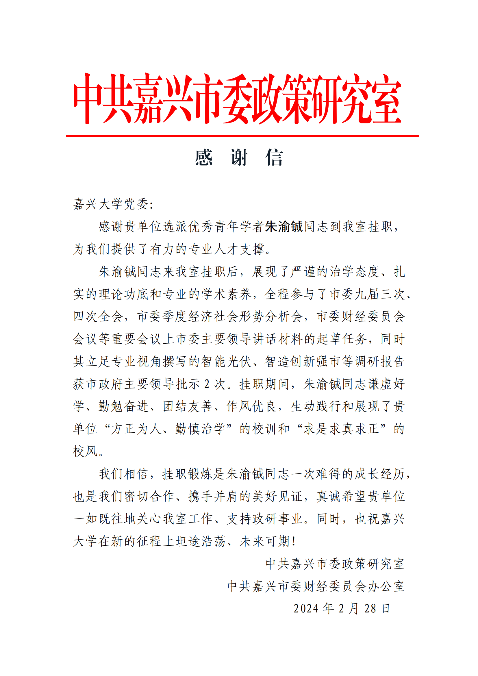 近日,中共嘉兴市委政策研究室发来感谢信,对金年会挂职教师朱渝铖博士提出表扬。