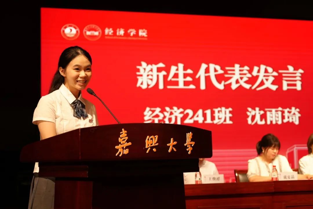 新生代表、经济241班沈雨琦在发言中表示宏伟古朴的龙星阁、尚德楼的上课铃声、校园里的书香气息都让她对未来的4年生活充满了期待和信心。作为红船旁的莘莘学子,将大力弘扬伟大建党精神和红船精神,认真做人、踏实学习,将校训和院训作为立身立学的准则,内化于心,外化于行,用青春践行“请党放心,强国有我”的铿锵誓言。