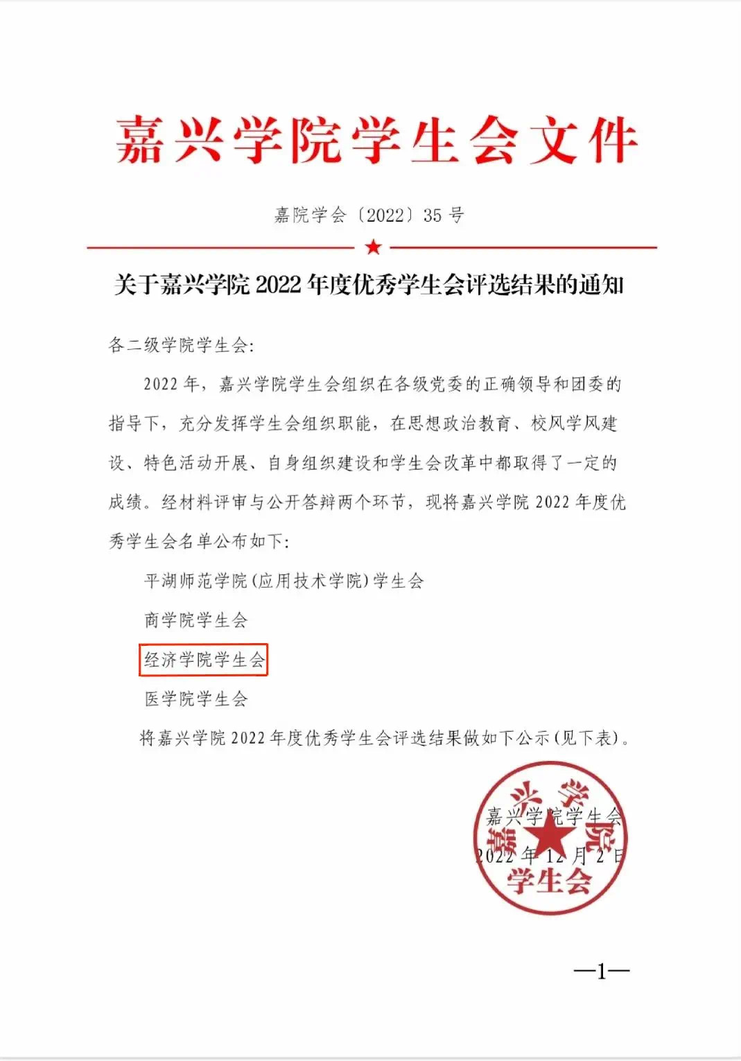 近日,在嘉兴学院2022年度优秀学生会评选中,经材料评审与公开答辩两个环节,金年会学生会荣获“嘉兴学院2022年度优秀学生会”。