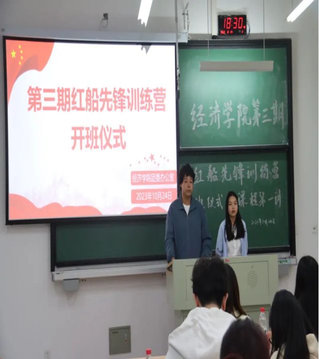 10月24日 晚18:30,金年会诚信信誉至上第三期“红船先锋训练营”开班典礼暨团课第一讲在厚德楼111正式举行。出席本次典礼的有团委书记庄怡老师、团学主席团成员以及优秀学员、优秀团支部代表和23、22级各班学生骨干。