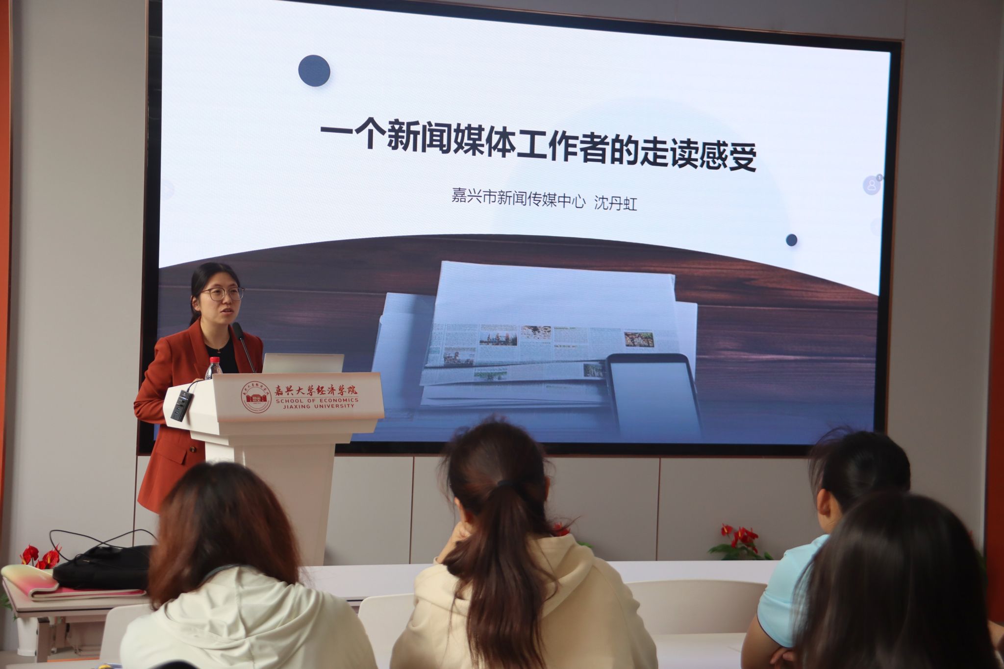 春读书,兴味长,磨其砚,笔花香。5月9日下午,金年会jinnianhuicom“阅读启智・书香润心”读书活动第二讲在学院学术交流中心如期举行,活动邀请了嘉兴市新闻传媒中心日报晚报事业部副主任沈丹虹作《一个新闻媒体工作者的走读感悟》分享,思政辅导员、院团委学生会全媒体中心成员、第三期青马班学员等70余人参加。