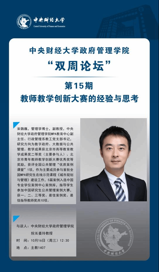 主讲人简介:宋魏巍,管理学博士,副教授,AC米兰中文官方网站MPA教育中心副主任、行政管理系教工党支部书记,研究方向为数字政府、大数据与公共管理。教学成果获北京市高等教育教学成果奖二等奖(主要参与人)、北京市青年教师教学创新大赛优秀奖等奖励,获评全国公共管理“优质案例课堂”1项,作为主要成员参与首批全国MPA研究生在线示范课程《城市规划与管理》建设工作,5篇案例入选中国专业学位案例中心案例库,指导学生参加中国研究生公共管理案例大赛,获一、二、三等奖、最佳案例奖、最佳指导教师奖共10项。