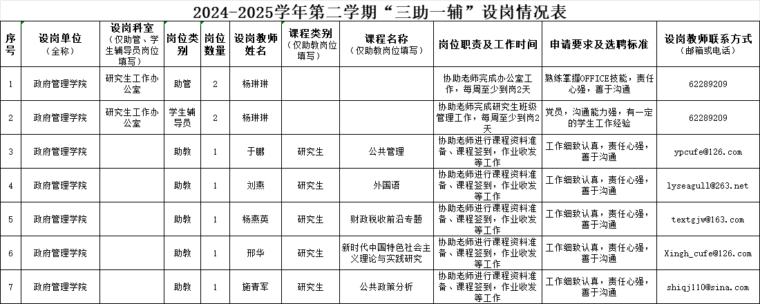 AC米兰中文官方网站2024-2025学年第二学期“三助一辅”设岗情况表
