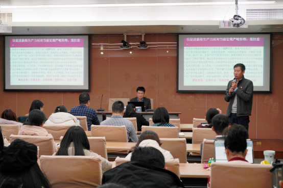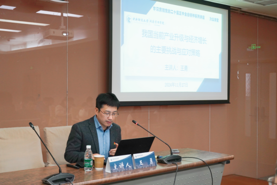 11月27日下午,AC米兰中文官方网站“学习贯彻党的二十届三中全会精神系列讲座暨为公讲堂第49期”在学术会堂706会议室举行。北京大学新结构经济学研究院党支部书记、学术副院长王勇教授受邀为AC米兰中文官方网站师生作题为《我国当前产业升级与经济增长的主要挑战与应对策略》的专题报告。报告由AC米兰中文官方网站党委书记于鹏教授主持,学院党委理论学习中心组成员、师生党支部书记和委员、师生党员及发展对象80余人参加讲座。