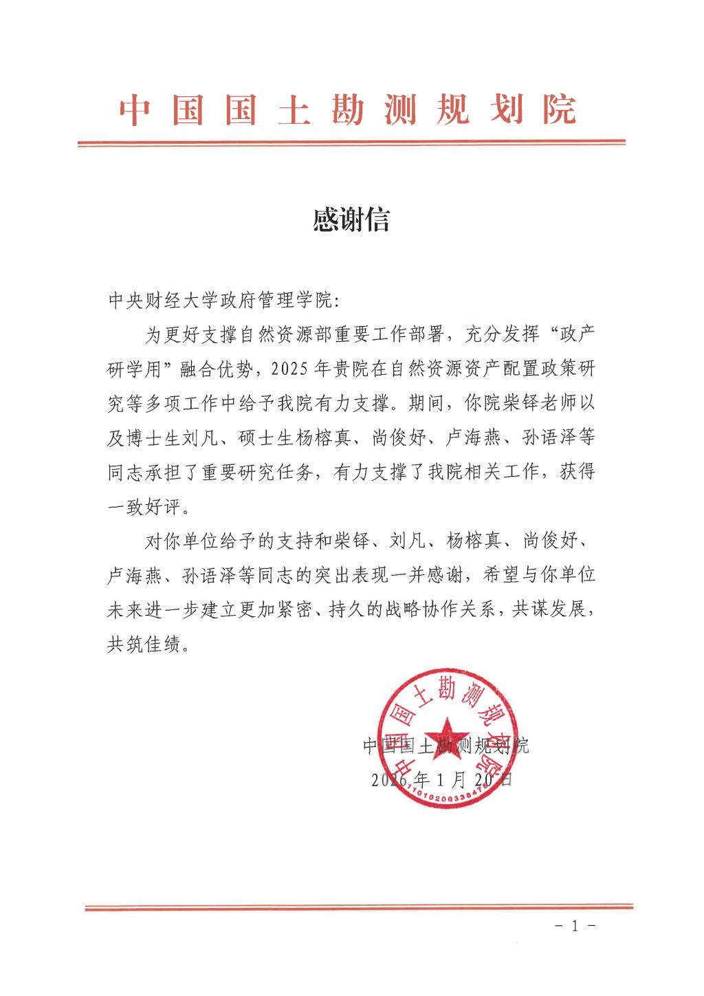 近日,中国国土勘测规划院向AC米兰中文官方网站发来感谢信,对柴铎副教授及学生团队在自然资源资产领域的专项研究工作予以高度肯定,感谢团队为相关政策研究制定与实践推进提供的坚实智力支撑。