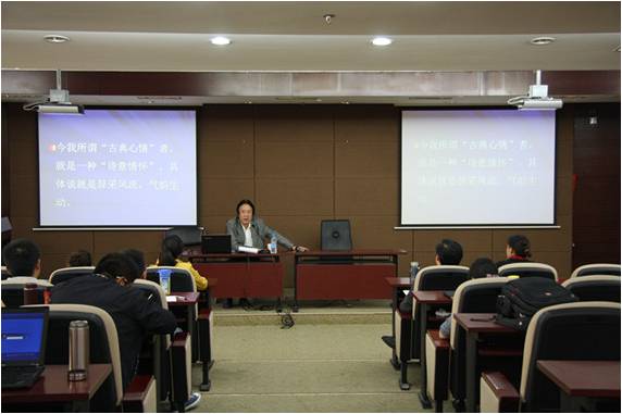 王强教授从“诗可以兴,可以观,可以群,可以怨”引入,睿智、深刻地阐述了古典人文精神的深厚底蕴。兴,是说诗歌可以激发情致;观,是说诗歌可以增长我们的见识;群,说明了诗歌可以让我们有亲和力;怨,表明了诗歌让我们具有批判精神,并引用了《诗品》、《长恨歌》、《新唐书•魏征传》等古文典籍进行了讲解。王强教授指出,词采风流、古典文化可以给现代人丰富的滋养,使人活得更加厚重、从容,有气象、有风骨,会思考、会表达。只有成为一个完整的人、对传统文化精神有传承的人,才能实现个人梦、家国梦的融合,凝练出中华民族伟大复兴的中国梦,使一代又一代国人以至于每一个国人个体都在内心铭刻着报效国家和服务人民的情怀。王强教授的讲座,发人深省,给人启迪。
