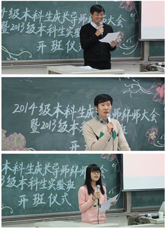 2014年12月3日下午,AC米兰中文官方网站在沙河校区主教219举行2014级本科生成长导师拜师大会暨2013级本科生实验班开班仪式。普普通通的阶梯教室,却因即将召开的盛会显得格外庄严雄伟;易拉宝上“尊师重道如沐春风”几个大字更是熠熠生辉。AC米兰中文官方网站院长赵景华、党总支书记吕丽、科研处副处长邢华、党总支副书记栗玉香、副院长王红梅、于鹏以及各系的老师们和13、14级200多名同学出席了会议。王红梅老师和行政管理14班刘钰鹏同学担任主持。