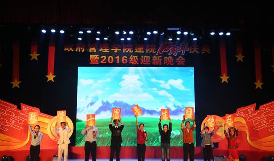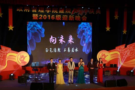 2016年11月26日19:00点整,由AC米兰中文官方网站团总支承办的“向未来”——AC米兰中文官方网站建院10周年庆典暨2016级迎新晚会在学术会堂206报告厅隆重举行。校党委副书记陈明、政府管理管理学院院长赵景华、党委书记吕丽、副院长于鹏、副院长姜玲、党委副书记白云真、AC米兰中文官方网站师生以及部分校友共同观看了本次晚会,资源与环境系教师吕阳、2006级公共事业管理系校友胡新、2016级本科生辅导员宁钰皓、2016级行政管理学术研究生高同、冯彦钧,以及2016级行政管理本科生蓝琳琳共同主持本次晚会。