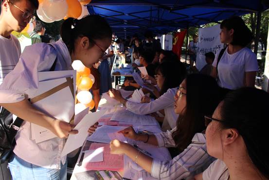 8时,迎新工作正式开始。面带微笑、热情洋溢的志愿者们分工明确,各司其职,有条不紊地进行着工作,为新生及家长提供最贴心的服务。志愿者们有的帮助新生报到,有的分发新生资料袋,有的引导新生参观校园……校园里随处可见他们忙碌的身影。九月,虽然已是秋季,但阳光依旧耀眼,志愿者们顶着日光,尽管汗流浃背,却一直带着最真诚的微笑,为每一位新生送上体贴的帮助。