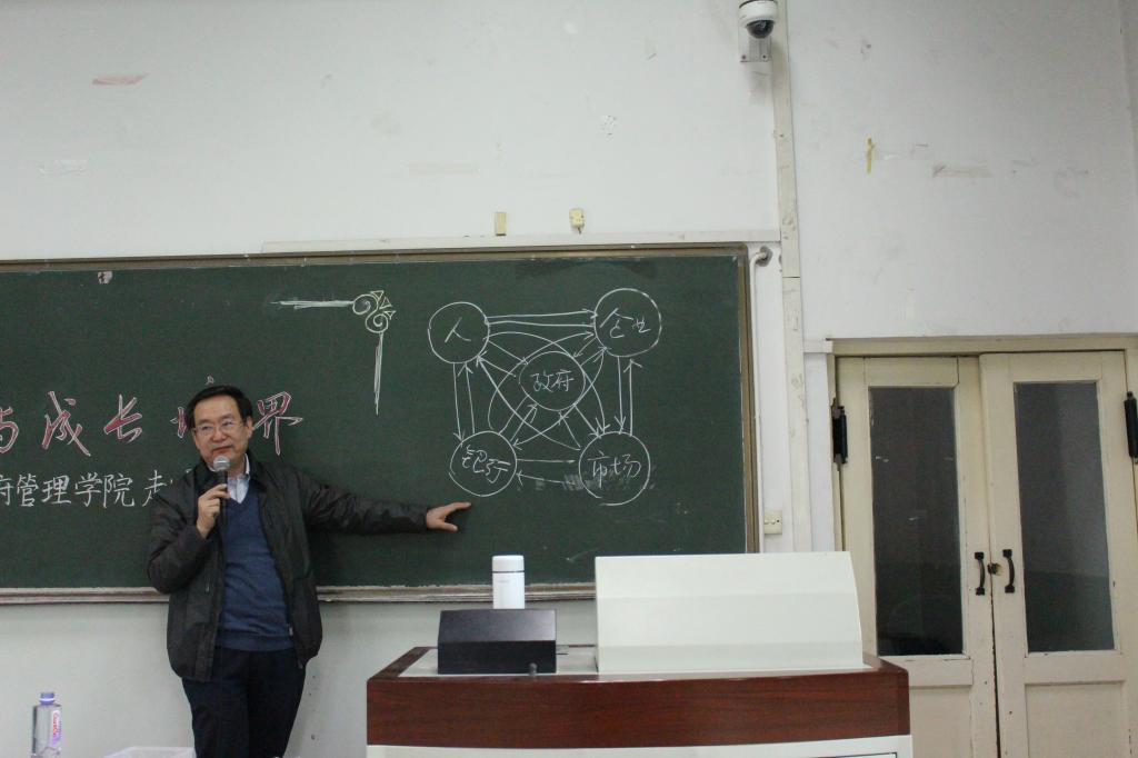 接着,赵院长介绍了公共管理的研究方向与研究主题。赵院长通过模型图的方式从政府、人、企业、市场、银行这五个主体两两之间的双向关系让同学们理解在中国国民经济的运行中不同学科发挥的作用。赵院长讲到,公共管理作为管理学下属的一级学科,探讨政府管理,却又不应局限于政府这一方主体;公共管理专业要以政府为研究核心,探讨市场经济下的多方关系与纽带,致力于国民经济管理中政府如何更好发挥自身作用的研究。赵院长对于公共管理的解读,让在场的同学们对于所学专业有了更深入的战略性、全局性的认识,使同学们深刻领悟到将来作为公共管理人才所应承担的使命与责任。