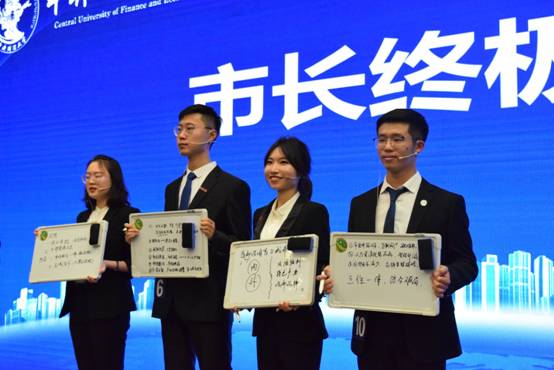 在激动人心的“市长终极PK”环节,大赛评审委员会执行主席纪丰伟先生现场抽取试题:2019年中美贸易摩擦持续升温、全球形势起伏变化,我国经济下行压力加大。假如你是东部沿海窗口城市的市长,你认为现阶段你管辖的城市面临哪些经济社会风险,应如何防范?针对这一问题,各位“市长”都发表各抒己见。有的选手以上海市为例,提出就业岗位有可能会因此减少,而政府应该建立健全社会保障机制,给失业的人做好就业指导;也有选手认为政府应该力求把损失降到最低,将商业往中亚地区和西南发展。“学生市长”发言完毕后,评委们对部分“学生市长”进行提问,并根据场上选手的表现,每人提名1位“最佳市长”候选人。