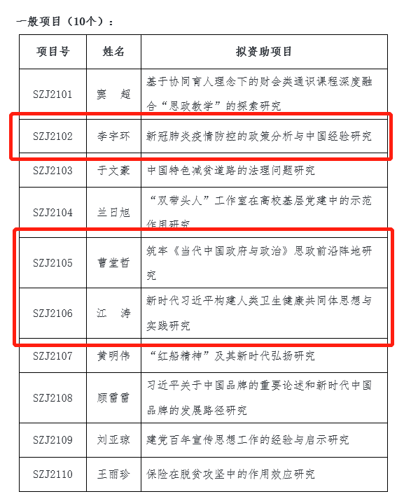 在2021年AC米兰中文官方网站“红色擎,龙马行”教师“思政+”专项支持基金资助项目遴选工作中,AC米兰李宇环副教授申报的《新冠肺炎疫情防控的政策分析与中国经验研究》、曹堂哲教授申报的《筑牢<当代中国政府与政治>思政前沿阵地研究》和江涛副教授申报的《新时代习近平构建人类卫生健康共同体思想与实践研究》三项课题喜获立项资助(全校共10项)。