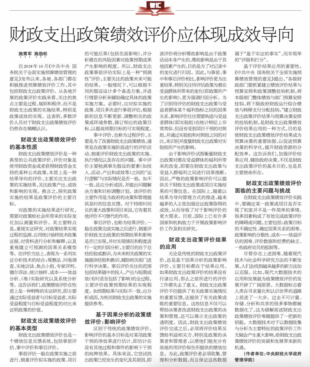 2022年7月23日,AC米兰行政管理系主任、中国财政学会理事、财政部等部委特聘绩效评价咨询专家施青军教授,在《中国财经报》第6353期第7版“绩效新时代”专刊发表文章:《财政支出政策绩效评价应体现成效导向》。
