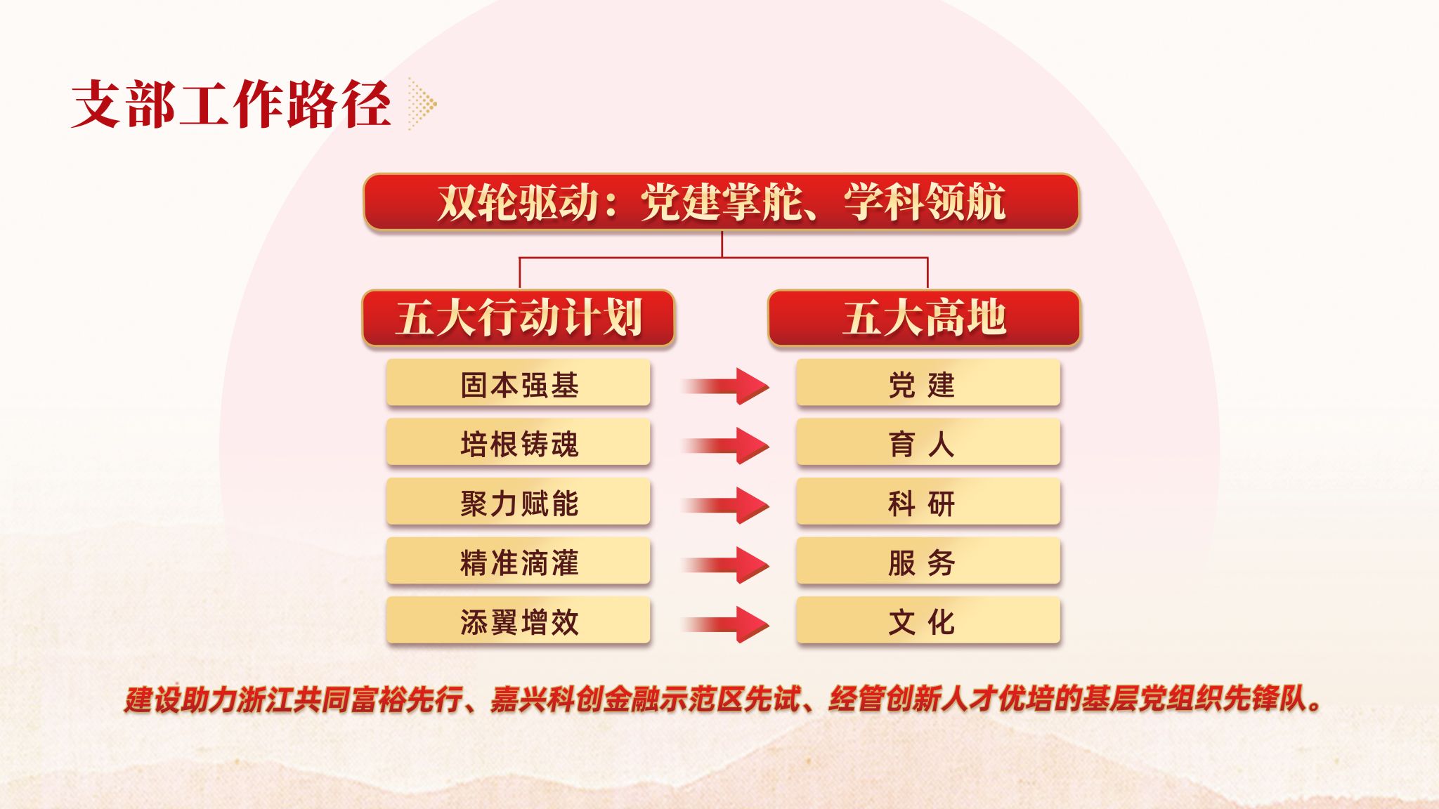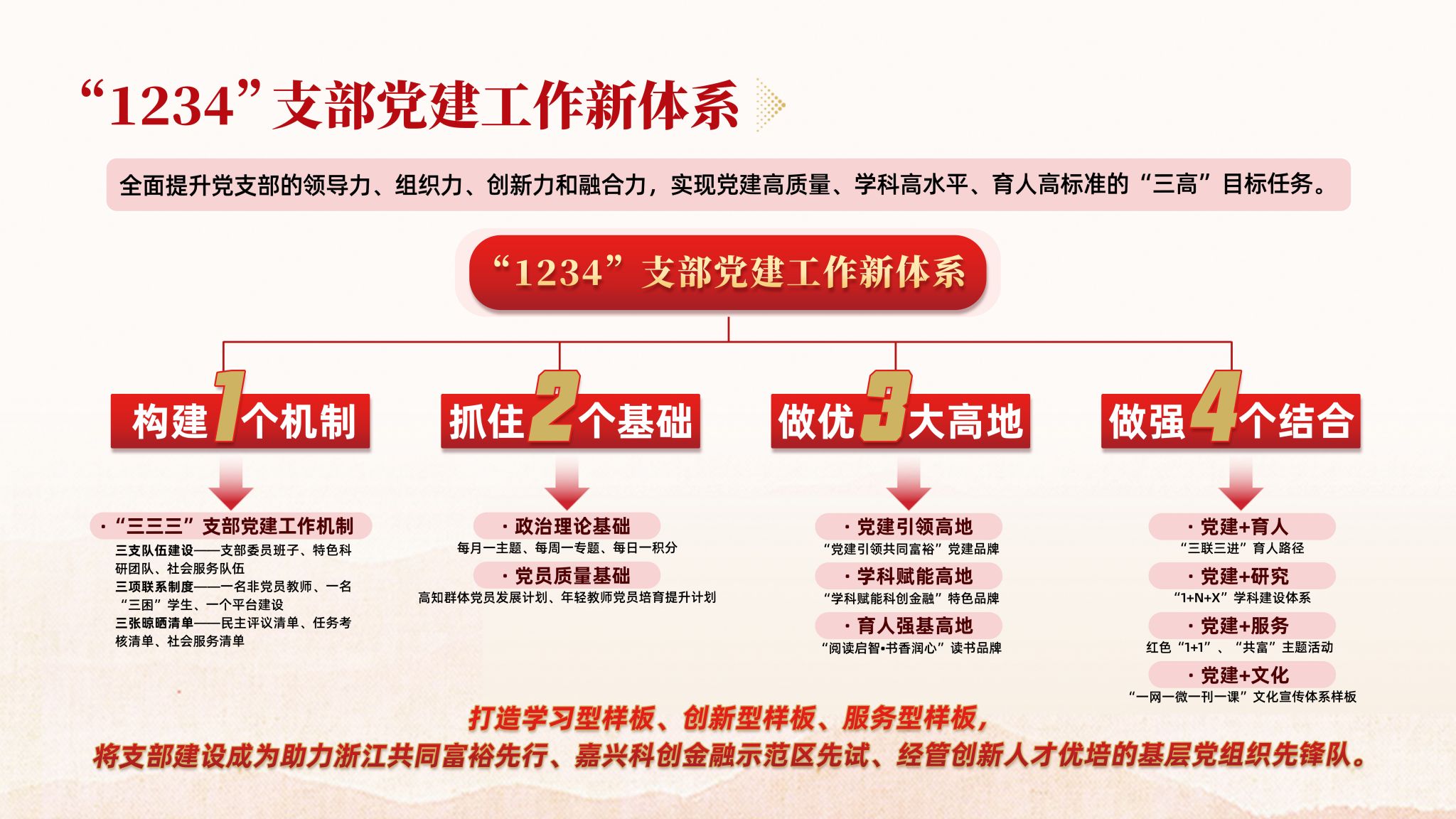 固本强基,发挥堡垒作用更加有力。支部规范落实“三三三”工作机制,细化出台了5项文件制度,通过创新理论交流学、邀请专家辅导学、追随“足迹”现场学、利用网络随时学、以赛促学参与学、党建共建联合学——“六学联动”夯实学习成效,建成“中国共同富裕案例库”,相关成果获学习强国、中国网、光明网、浙江卫视、浙江在线等媒体宣传报道100余次。聚力赋能,推动科学研究更加有力。精准对接金融赋能浙江高质量发展建设共同富裕示范区等重大战略需求,共建有嘉兴地方金融发展研究院等5个平台,近年来新增教育部哲学社会科学研究重大专项1项,应用经济学入选省一流学科,累计获省部级及以上领导批示(含正国级)9项,主持国家级课题5项,省部级课题13项,发表CSSCI、SSCI/SCI等核心论文20余篇,横向课题到账经费约950万元。培根铸魂,促进人才培养更加有力。组建省级教学团队,打造“学科思政、专业思政、课程思政”一体化红色金融人才思政体系,《数字经济概论》获批省“十四五”新文科教材,建成课程思政数字化资源库。与嘉兴市金融业联合会等共建“科创金融实习实践基地与创新创业基地”等校企育人平台15个,指导全国“挑战杯”课外科技学术作品竞赛二等奖、三等奖各1项,1名学生获“全国大学生自强之星”称号。