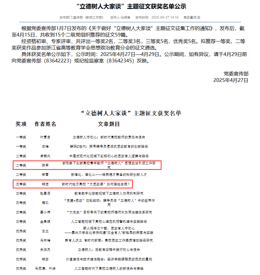 近日,校党委宣传部(教师工作部)公布了“立德树人大家谈”主题征文活动获奖名单。金融教师党支部积极组织,踊跃参与,最终斩获二等奖和三等奖各一项。